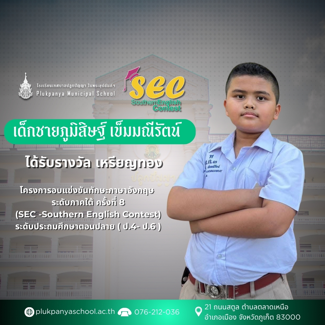 รางวัลแห่งความภาคภูมิใจ > เด็กชายภูมิสิษฐ์ เข็มมณีรัตน์ ได้รับรางวัล เหรียญทอง โครงการอบแข่งขันทักษะภาษาอังกฤษ ระดับภาคใต้ ครั้งที่ 8