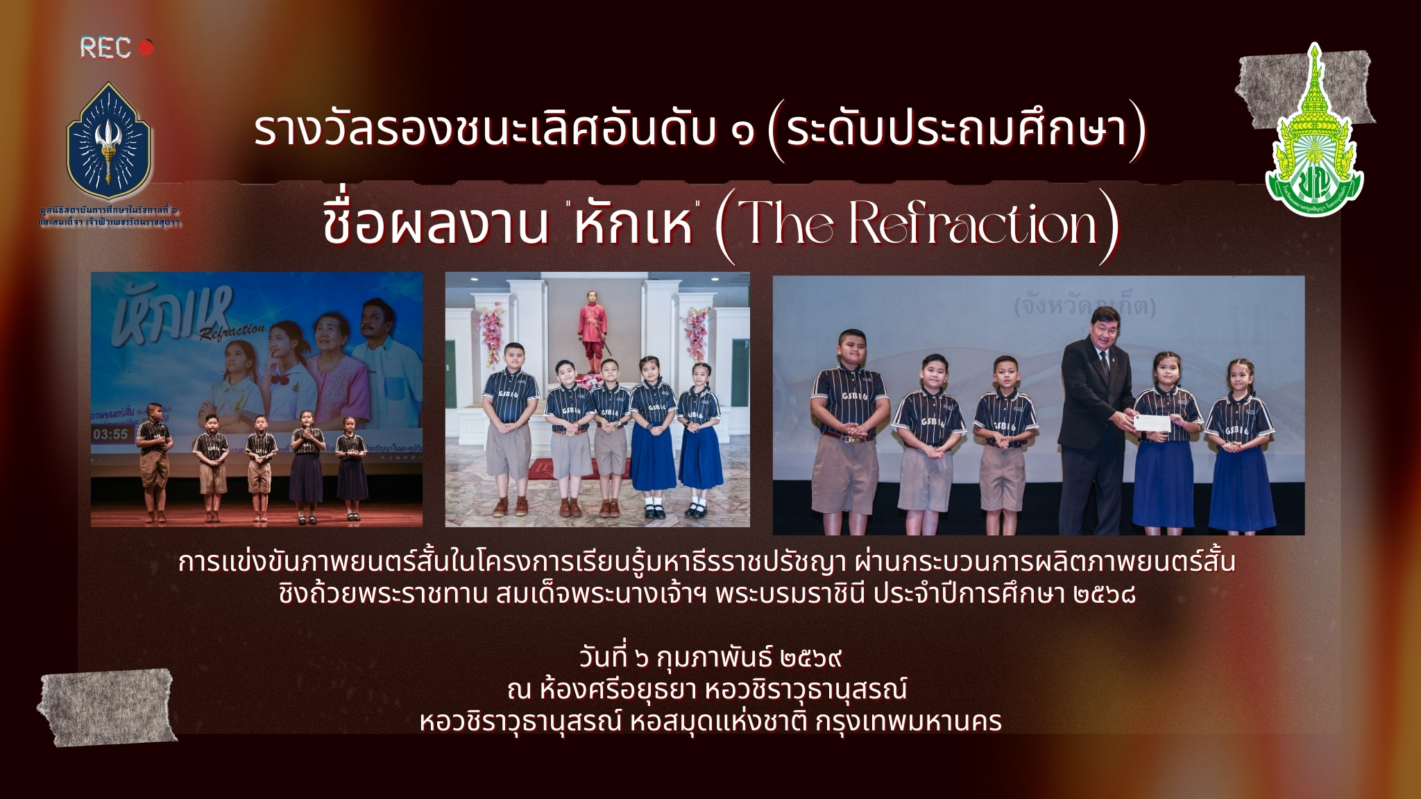รางวัลแห่งความภาคภูมิใจ > รางวัลรองชนะเลิศอันดับ 1 (ระดับประถมศึกษา) การแข่งขันภาพยนตร์สั้น ชิงถ้วยพระราชทาน สมเด็จพระนางเจ้าฯ พระบรมราชินี ประจำปีการศึกษา 2568