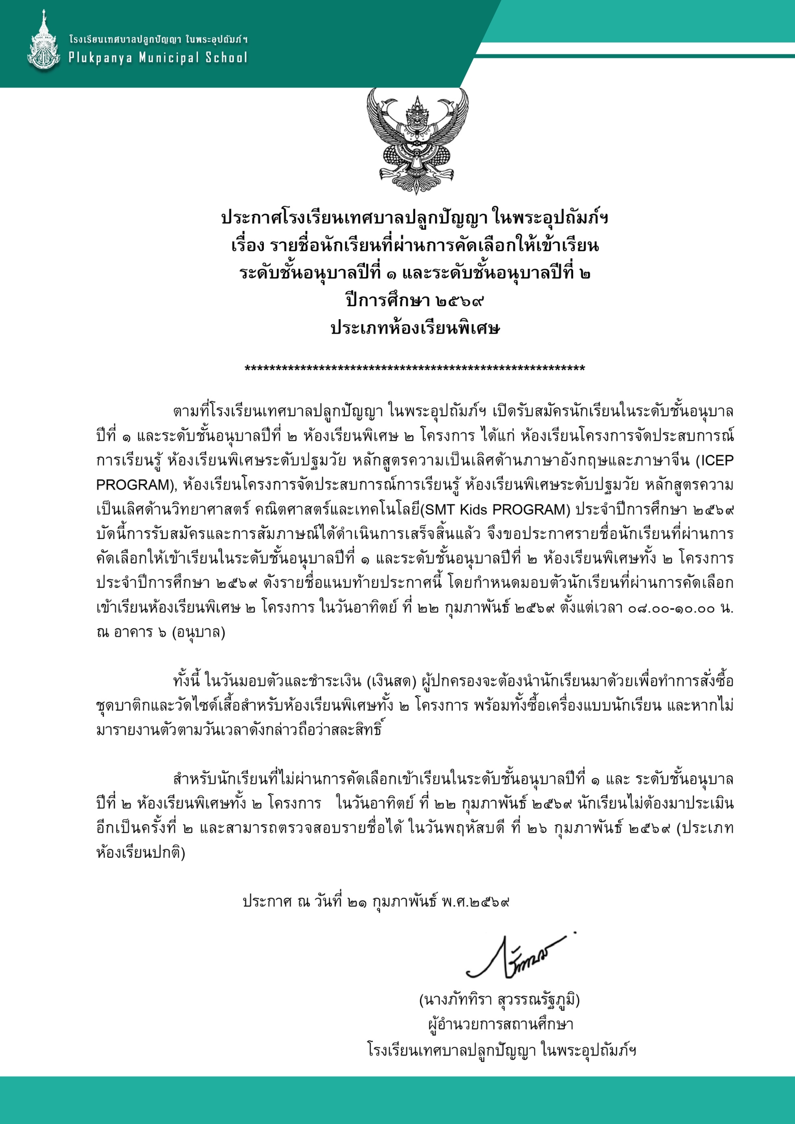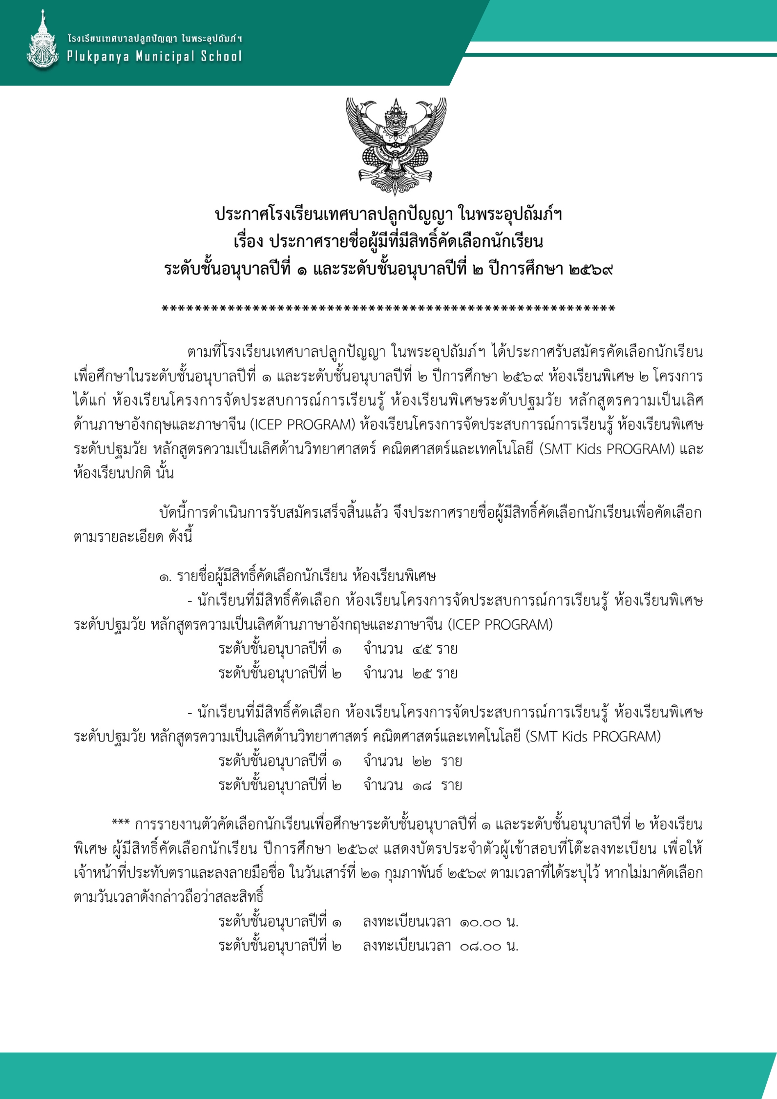 ประกาศ รายชื่อนักเรียนที่ผ่านคัดเลือกเข้าเรียน ระดับชั้นอนุบาล 1 และ ระดับชั้นอนุบาล 2 ปีการศึกษา 2569 ห้องเรียนพิเศษหลักสูตร SMT Kids และ ICEP