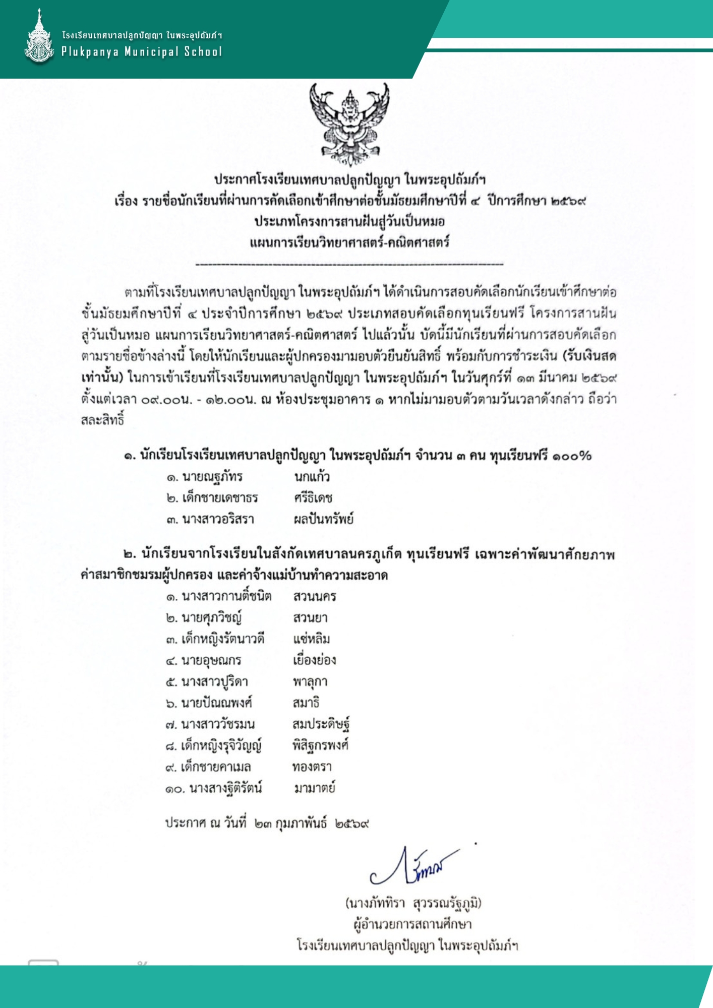 ประกาศ รายชื่อนักเรียนที่ผ่านการคัดเลือกเข้าเรียนชั้นมัธยมศึกษาปีที่ 4 ปีการศึกษา 2569 ประเภทโควตาเรียนดี